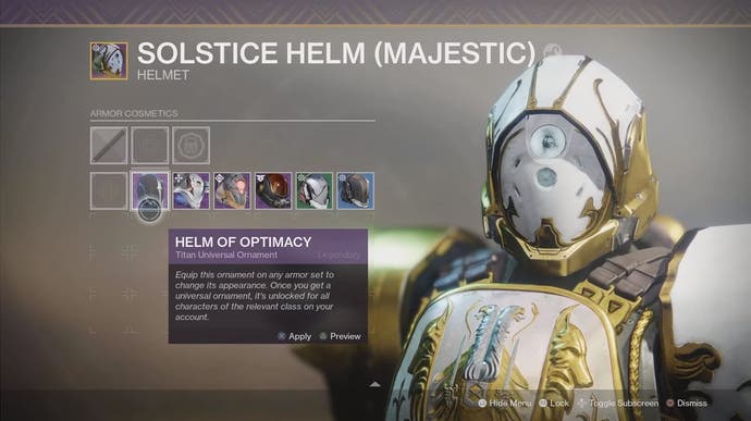 Diperkenalkan dengan Shadowkeep dan ‘Armor 2.0 ” revamp, memungkinkan potongan baju besi yang dilepaskan dari tahun 3 dan seterusnya untuk melengkapi ornamen universal, sejenis kosmetik yang mengubah penampilan mereka.