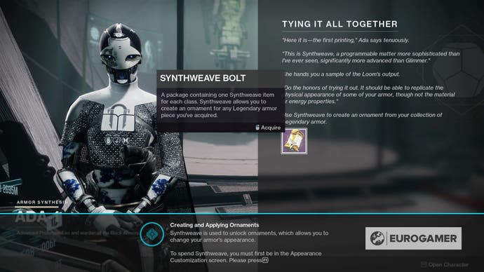 Setelah selesai dengan tugas pengantar, ADA-1 akan memberikan pengikat semuanya bersama. Hanya dengan menerimanya, Anda akan menerima satu synthweave per kelas secara gratis, yang digunakan untuk membuat dan menerapkan ornamen.
