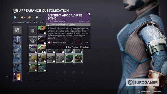 Pilih peralatan legendaris apa pun, dan daftar ornamen akan ditampilkan. Pilih Anda, yang akan menelan biaya 1 synthweave, dan buka kunci. (Menghabiskan Synthweave diperlukan untuk menyelesaikan Langkah Quest yang mengikat semuanya bersama.) Jika Anda bertanya -tanya, ya, Anda juga dapat melihat pratinjau beberapa bagian sebelum membuat pilihan Anda.