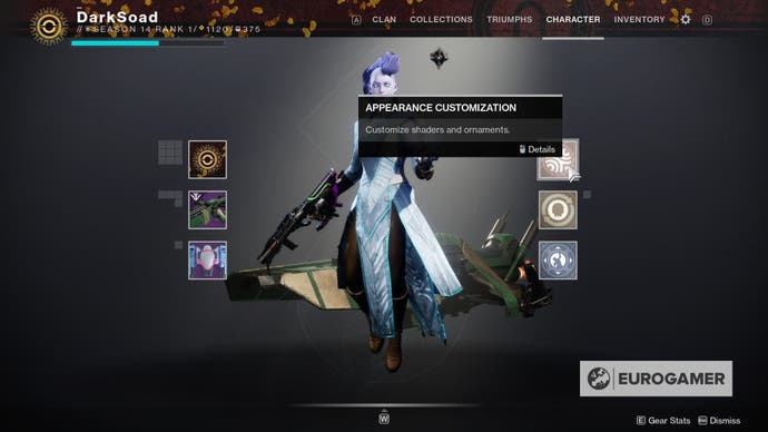 Dari sini, Anda dapat membuat perubahan kosmetik – termasuk melengkapi ornamen universal, shader dan jika didukung, bersinar.
