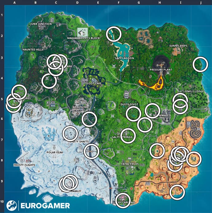 Berikut ini lebih dekat melihat beberapa lokasi panggangan spesifik di Fortnite. Kami tidak akan menunjukkan semuanya, tetapi sebaliknya fokus pada beberapa tempat spesifik dengan kelompok panggangan – dengan cara itu, Anda dapat menandai 2-4 dalam satu kunjungan, dan membuat proses ini berjalan lebih cepat.